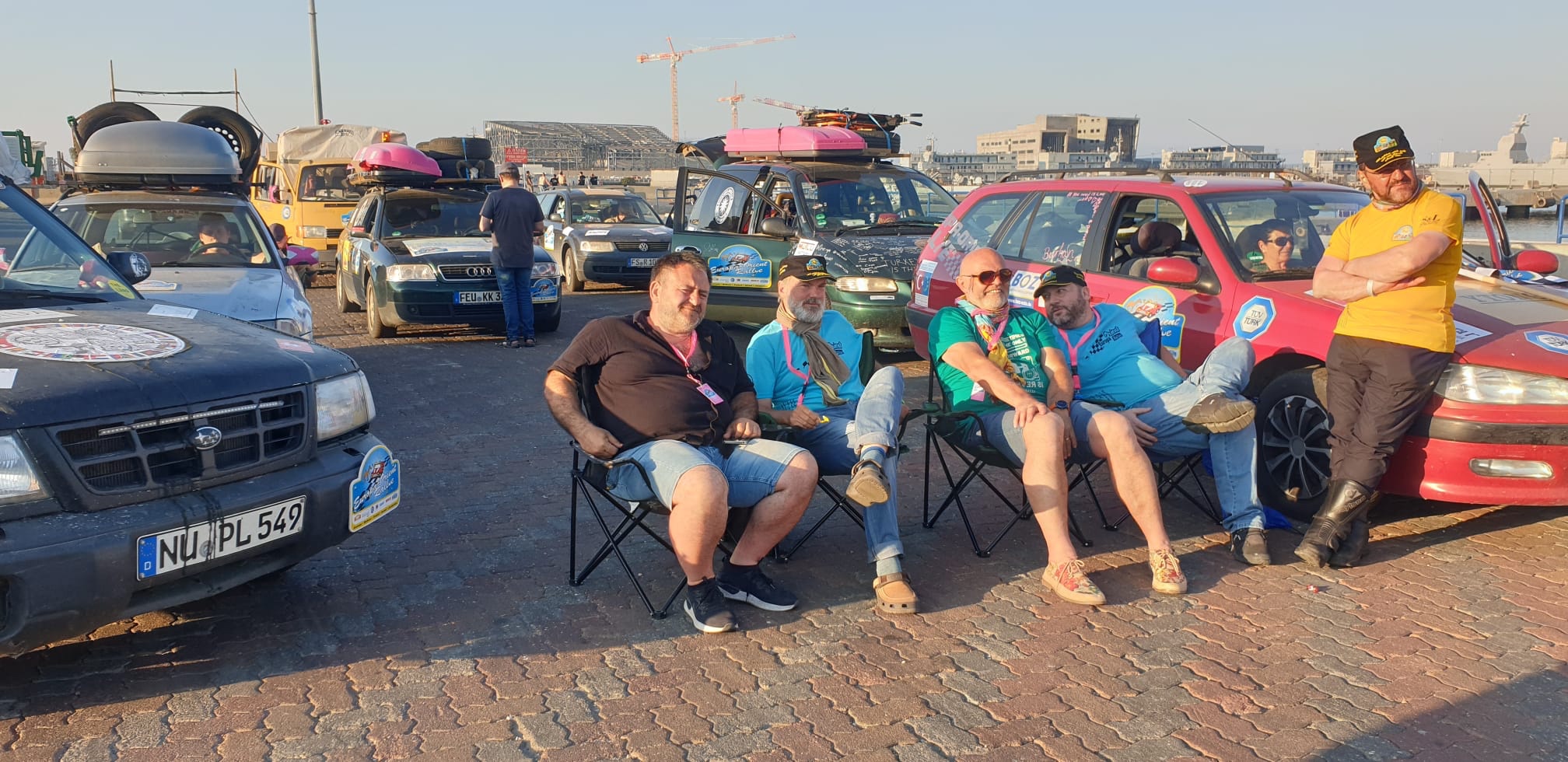 Dank der gut betonierten Hafenanlage, bruzzelt die Rallyreisegruppe leise vor sich hin, trinkt Bier und staunt wie der Zoll das Protokoll erfüllt. Alles gescannt, aber kein Einziger musste den Raum für das Ersatzrad öffnen.