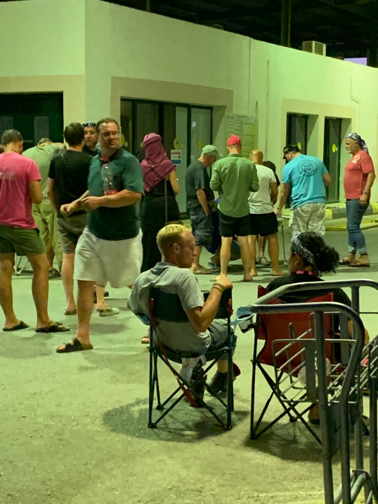 Halbverlumpte Typen (die aus Rottal Vollverlumpt) passieren das Eingangstor inkl. Unterbodencheck auf Autobomben, danach Check–in.